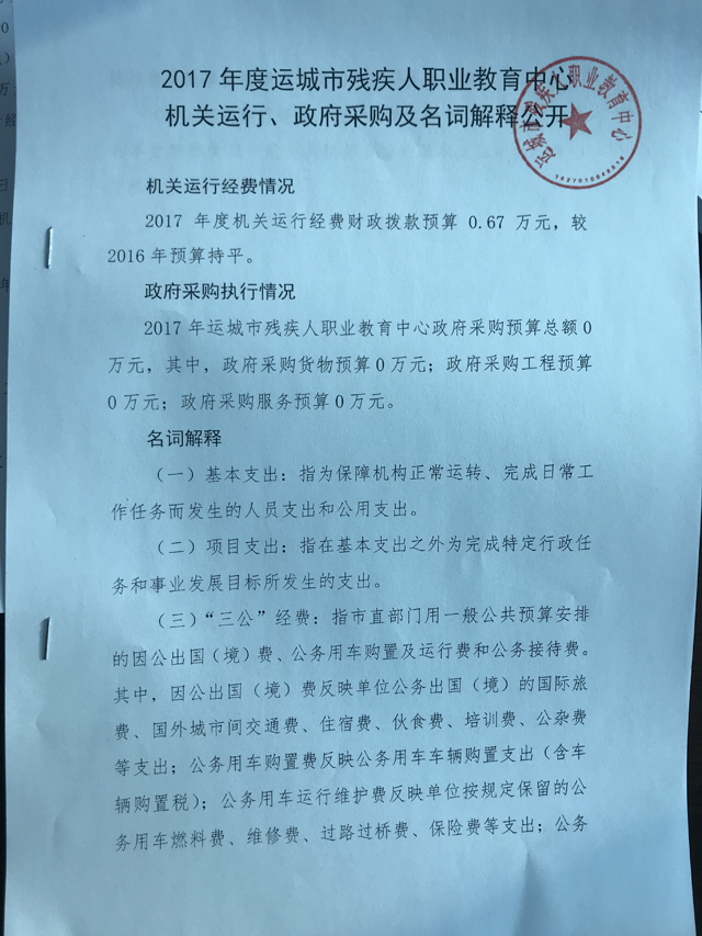 2017年度运城市残疾人职业教育中心机关运行、政府采购及名词解释公开