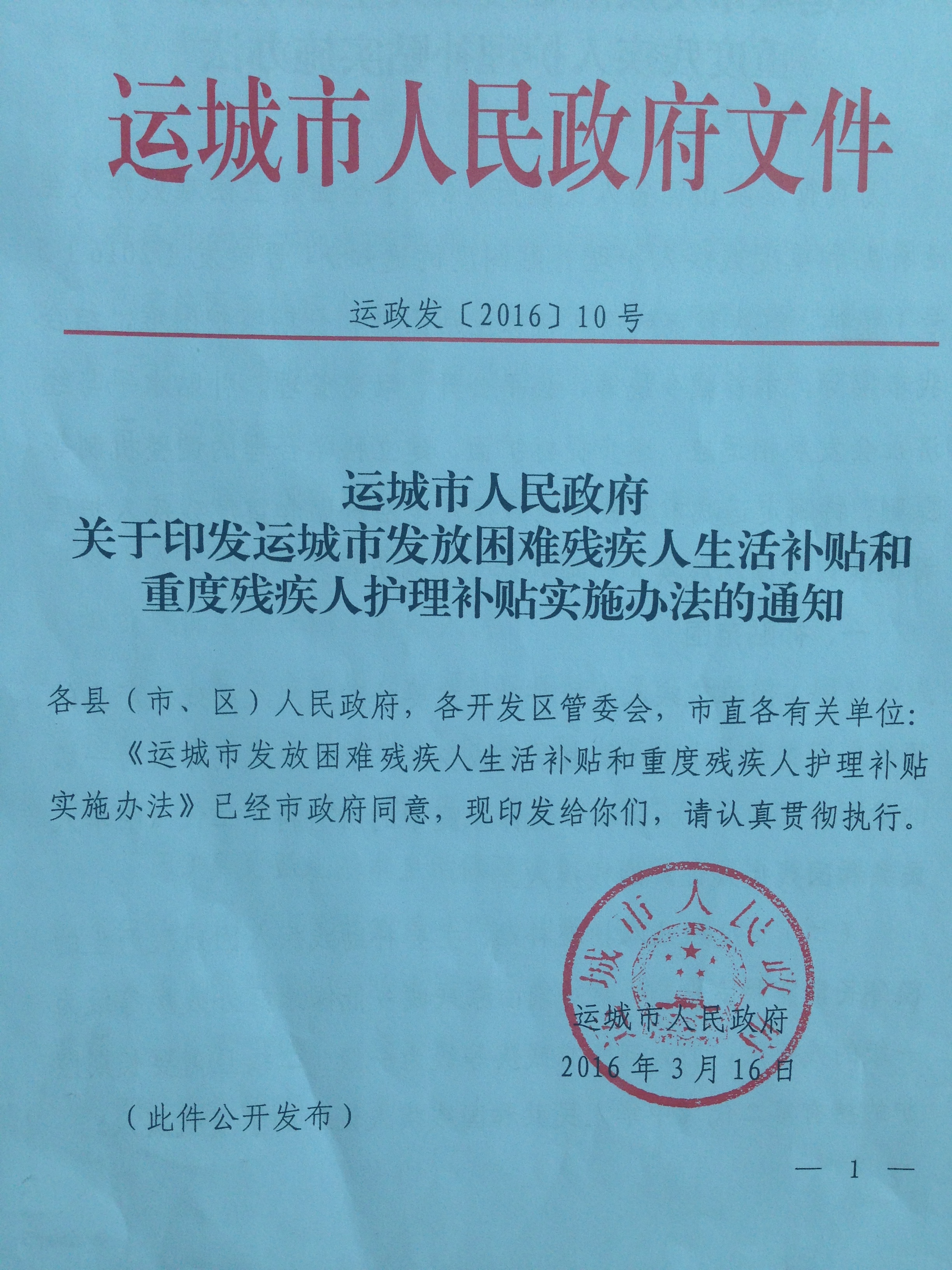 运城市人民政府关于印发运城市发放困难残疾人生活补贴和重度残疾人护理补贴实施办法的通知